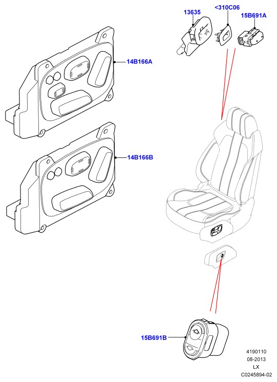 - Выключатель, левая сторона; сиденья с электроприводом и памятью эл/пр.-глуб./выс./накл.поз.сид.вод. эл/пр.-глуб./выс./накл.поз.сид.пас. без сочлененных спинок сидений 4канал.рег+валик+поясн.опора водит. масажн.поясн.опора,рег.валик-водит.