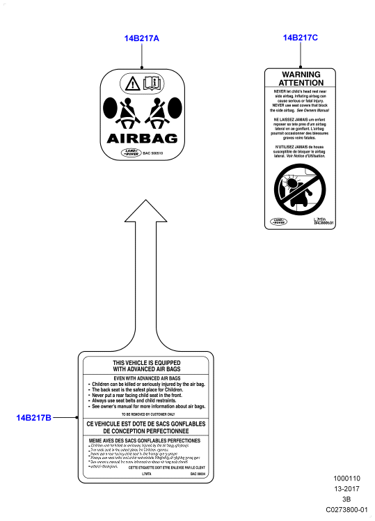 - Предупреждающая этикетка подушки безопасности для боковых подушек безопасности; '(-)"cdn/mex/usa"'