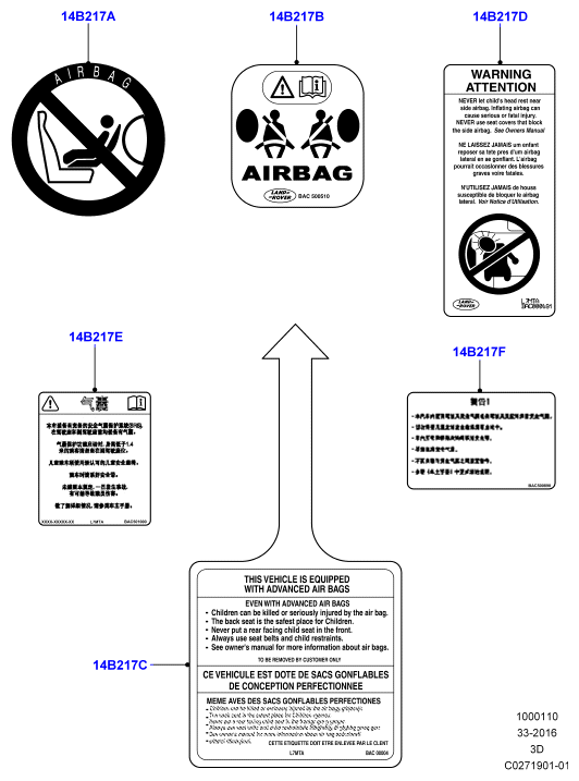 - Предупреждающая этикетка подушки безопасности для боковых подушек безопасности; '(-)"cdn/mex/usa"'